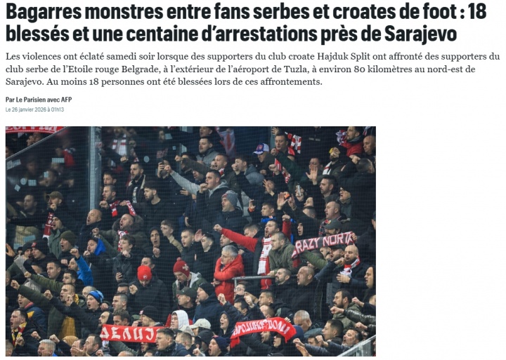 01月27日讯 据法媒《巴黎人报》报道,上周六晚间,克罗地亚和塞尔维亚的极端球迷爆发冲突,近百人被逮捕,造成至少18人受伤。